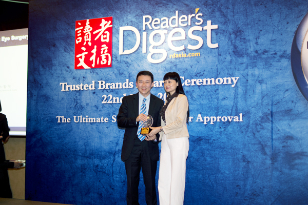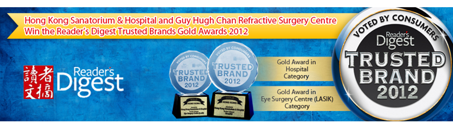Hong Kong Sanatorium & Hospital and its Guy Hugh Chan Refractive Surgery Centre received awards in 2012, namely the Reader's Digest Trusted Brands in Hospital Category and Eye Surgery Centre (LASIK) Category. The Hospital is honoured to receive the Reader's Digest Trusted Brands (Hospital Category) for the fourth time since 2008. Its Guy Hugh Chan Refractive Surgery Centre also received the Gold Award in the category of 'Eye Surgery Centre (LASIK)' for the second year running. The award testifies to the trust and confidence of the community as recognition of our commitment towards setting industry benchmarks of quality and customer satisfaction in our endeavours. The Hospital's vision continues to navigate us on the path to remarkable achievement and be the leader in the healthcare provider business. This achievement is certainly a source of inspiration for all of us to further heighten our levels of performance and maintain our growth trajectory.