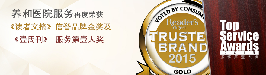 养和医院连续多年荣获《讀者文摘》信誉品牌金奖及《壹周刊》服务第壹大奖2015