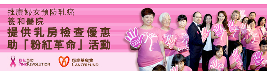 (香港,2013年9月24日) 乳癌一直高踞全球女性癌症首位,為向本港婦女推廣檢查乳房預防癌症的訊息,養和醫院支持香港癌症基金會的「粉紅革命」活動,提供500個「乳房X光造影檢查」優惠。凡年齡40歲或以上並在過去兩年未曾進行臨床乳癌檢查的本港女性,可於九月二十五日至十月三十一日期間,致電香港癌症基金會熱線:3656 0800報名。