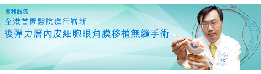 養和醫院於去年10月進行全港首宗「後彈力層內皮細胞眼角膜移植無縫手術(DMEK/Descemet's Membrane Endothelial Keratoplasty)」。此技術為嶄新的微創無縫眼角膜移植手術,新技術只需移植0.01毫米厚的精細眼角膜底層細胞組織,較傳統的「全層眼角膜移植手術(PKP/Penetrating Keratoplasty)」所需移植的角膜組織薄55倍,亦較現時的「板層角膜移植手術-後層眼角膜移植(DSEK/DSAEK/Descemet's Stripping Automated Endothelial Keratoplasty)」所需移植的角膜組織薄15-20倍,故新手術的術後排斥率較低,視力復原速度更快。