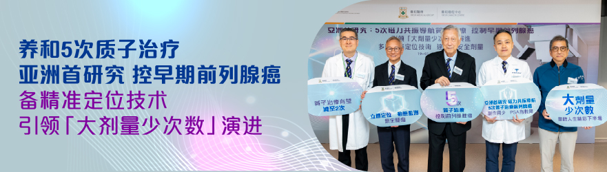 (2026 年 3 月 19 日-香港)养和医疗集团(养和)今天公布亚洲首个为早期前列腺癌患者进行 5 次质子治疗的临床研究*数据,结果疗效显着,前列腺特异抗原(PSA)指数大幅下降,且副作用轻微。采用质子治疗前列腺癌一般须进行约 30 次疗程,为期 8 至 9 个星期。养和癌症中心于 2023 年启用质子治疗服务,透过提高精准度以达到「大剂量少次数」的目标,把疗程次数大幅减少百分之八十,针对早期前列腺癌,采用质子放射治疗方案只需 5 次疗程,为期 2 至 3 星期,便有望控制疾病。同时,由于质子高度集中、到位释放的物理特性,治疗对附近重要器官如膀胱、肠道的影响轻微,有助提升患者治癌旅程中的生活质素。