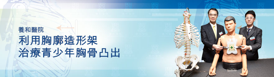 (2014年2月6日 — 香港)青少年於發育期間胸骨異常向外生長,俗稱「凸胸」或「雞胸」,嚴重者可影響心肺功能。即使病況輕微,亦可能令正值青春期的患者帶來心理成長及社交生活的障礙。養和醫院物理醫學及復康科部提供「胸廓造形綜合治療計劃」,結合復康科專科醫生、義肢矯形師及物理治療師的專業知識,為胸骨凸出患者提供非手術治療,最快兩個月內開始見效。治療成效高且風險低,而患者無需進行外科手術,免除手術可能帶來的風險。